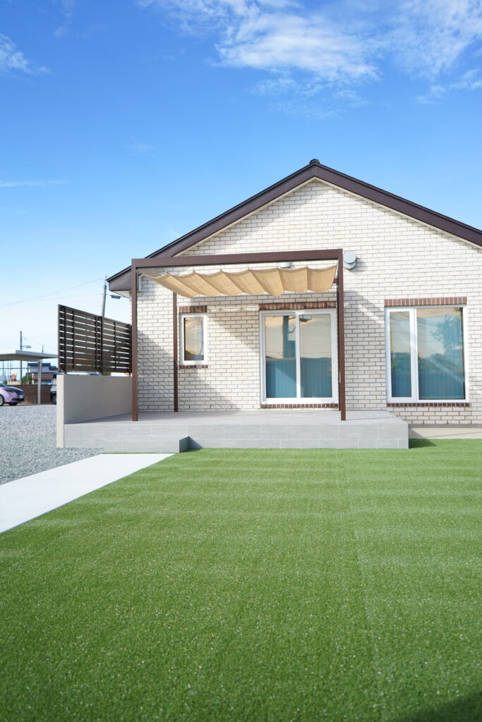 人工芝の鮮やかなグリーンとグレーのタイル、そしてウッド調パーゴラのコントラストが調和し、機能的でありながら高級感を日常に取り入れたモダンガーデンが完成しました